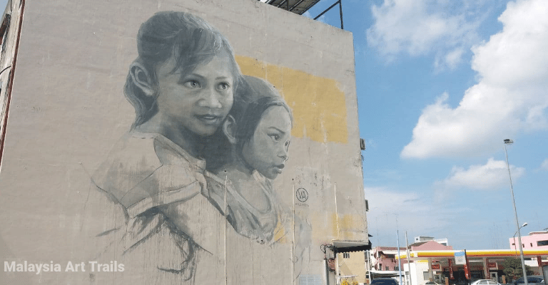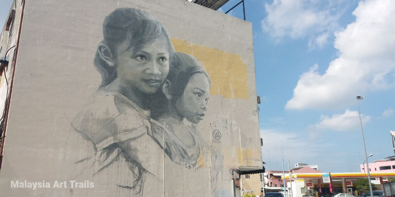 The most famous mural in Muar is unquestionably "The Loving Sisters." Created by Russian artist Julia Volchkova, this black and white portrait depicts two young sisters—aged 7 and 3—in a loving embrace. The incredible detail and emotional depth of this artwork make it a must-see attraction.